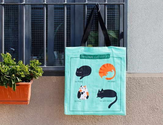 Printed Cotton Canvas Tote Bag - Original Cat Poses, illustrated cats in their favorite poses