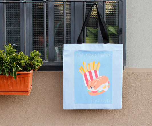 Printed Cotton Canvas Tote Bag - The Corgi Loaf, a tasty corgi-shaped sandwich