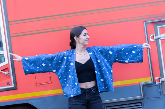 Kimono Jacket - Short Kimono in Blue Jacquard, Starry Night Pattern